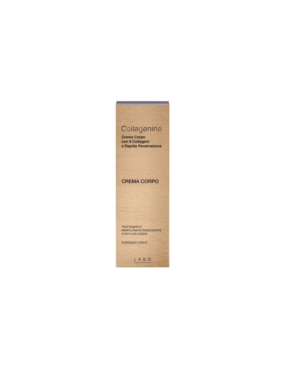 La crema corpo rimpolpante rassodante collagenina contiene 6 collageni con peso molecolare differenziato a rapida penetrazione (Hydrolyzed Collagen 2K Da, Collagen Amino Acids 2.4K Da, Hydrolyzed Collagen 4K Da, Hydrolyzed Collagen 12K Da, Soluble Collagen 230K Da, Soluble Collagen 300K Da) e componenti per la produzione di collagene dall’interno (glycine, proline, hydroxyproline, palmitoyl tripeptide-5) e per l’effetto antiglicazione (carnosine). Contiene inoltre un tetrapeptide che contrasta il rilassamento cutaneo e saccharide isomerate che nutre la pelle rinforzando la barriera cutanea.