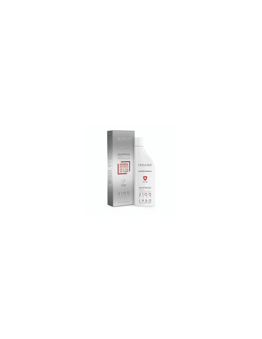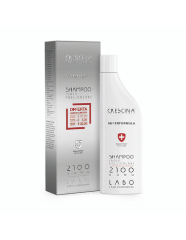 Labo Shampoo Crescina Isole Follicolari Superformula 2100 è uno shampoo indicato per uomini con problemi di capelli radi, diradati o con iniziale caduta. Formulato per supportare i trattamenti topici anticaduta della linea Crescina, questo shampoo agisce durante la fase di lavaggio grazie a una combinazione sinergica di attivi selezionati ed è ideale come supporto quotidiano per migliorare la salute del cuoio capelluto e facilitare la crescita fisiologica del capello.