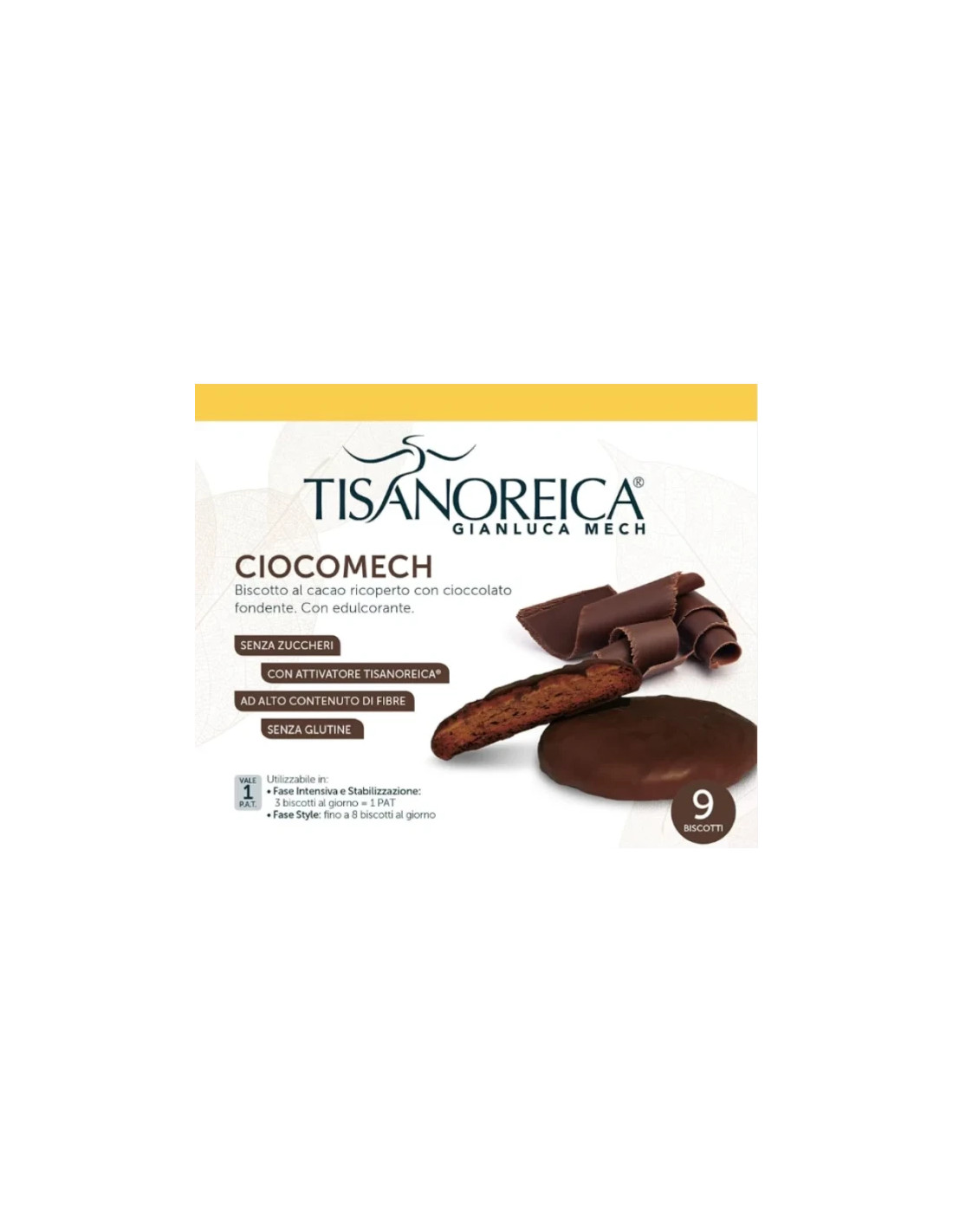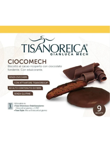 Gusta il piacere senza sensi di colpa con Tisanoreica Ciocomech: biscotto proteico al cacao con cioccolato, senza glutine e con edulcorante. Ideale per uno snack durante la dieta, ricco di proteine (39%), fibre, e a basso contenuto di zuccheri, è con Attivatore Tisanoreica e contribuisce al benessere metabolico.