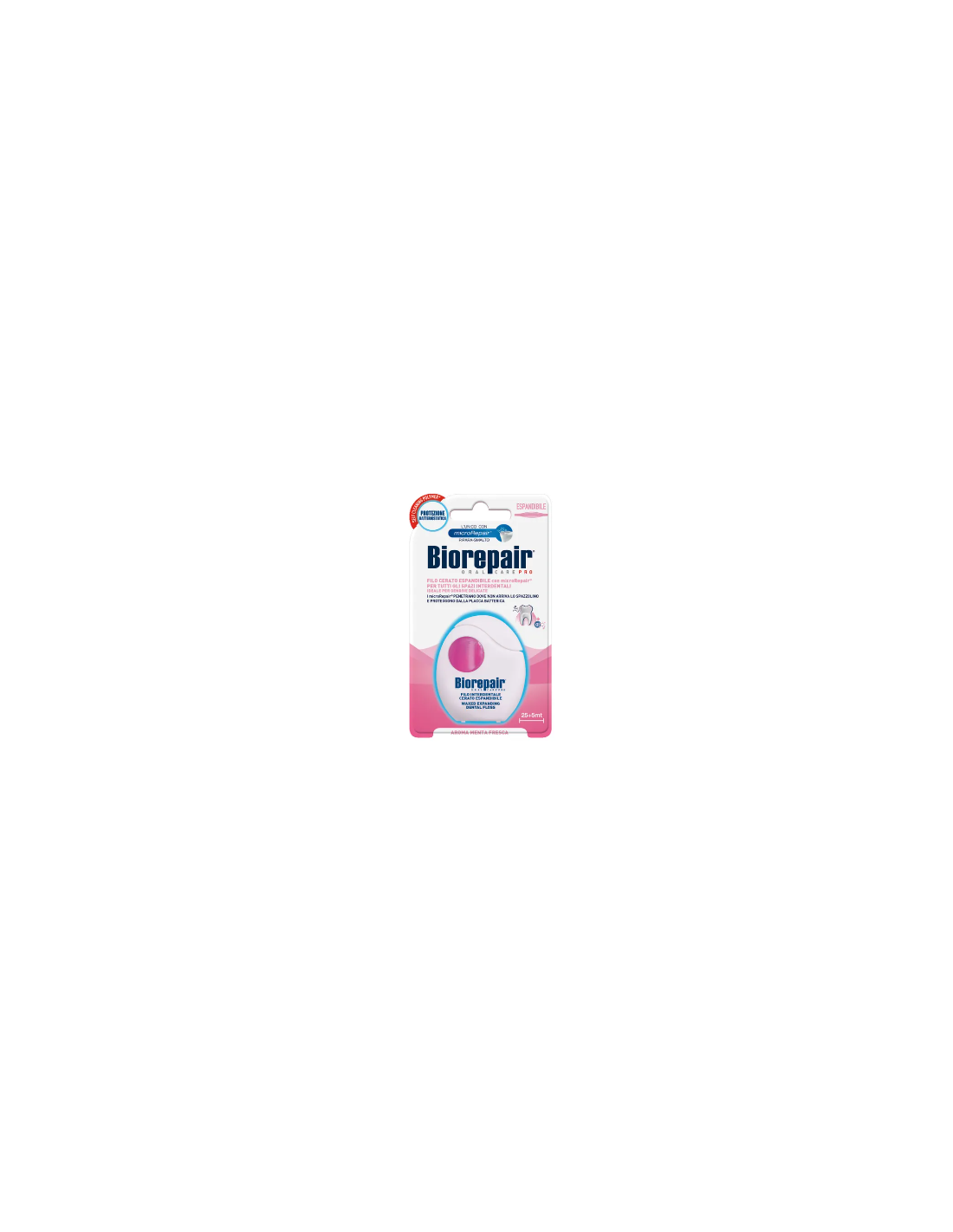 Il Filo Espandibile Biorepair sottile inizialmente , si gonfia durante l'utilizzo andando ad adattarsi a ogni spazio interdentale, permettendo la rimozione in modo efficace della placca anche nelle zone più difficili.