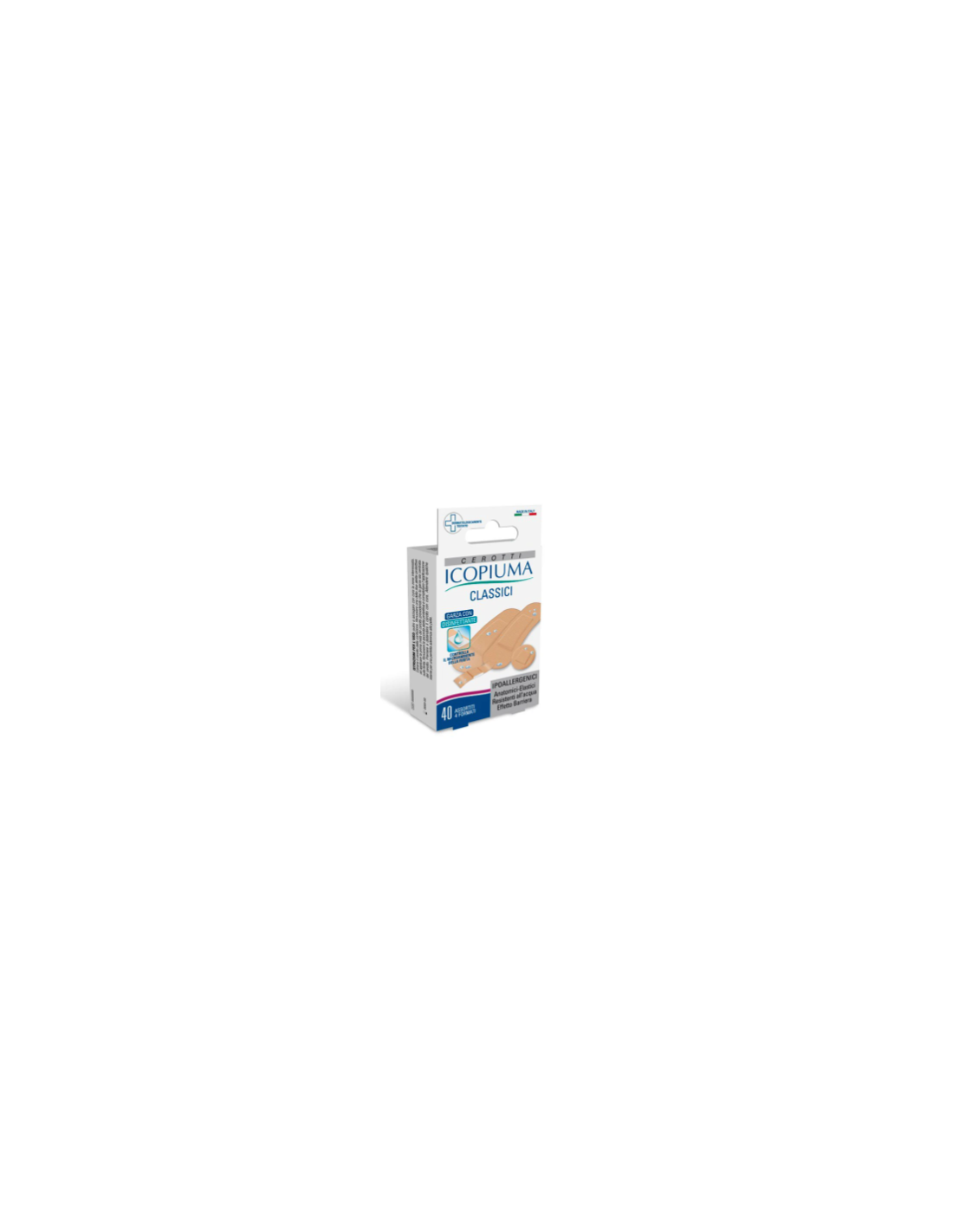 Cerotti classici ipoallergenici 4 formati: 7 x 2 cm, 4 x 1 cm, 7 x 3 cm, ø 2,5 cm.
